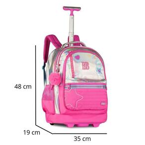 Um modelo exclusivo e cheio de estilo, a mochila de carrinho Rebecca Bonbon RB27016 é confeccionada em PVC holográfico com bordado de estrela, patches no painel frontal, etiqueta emborrachada e cadarços estampados, trazendo um design moderno e único. O compartimento principal é muito espaçoso e conta com divisória acolchoada para notebook e outra para tablet. Além disso, possui dois compartimentos frontais com fechamento por zíper, sendo um deles com divisórias internas, além de bolsos laterais telados duplos. Acompanha chaveiro triplo, incluindo um pompom com orelhinhas super charmoso, além de cartela de adesivos exclusivos da Rebecca Bonbon. Pode ser Utilizado como mochila de carrinho, com rodinhas resistentes, puxador de metal com duas alturas e trava, além de base de apoio frontal. Ou, se preferir, pode ser Utilizado nas costas, já que possui alças acolchoadas ajustáveis que ficam guardadas em compartimento traseiro fechado por zíper, junto com protetor de rodinhas para evitar sujeiras nas roupas. Conta ainda com alça de mão superior. Todos os puxadores de zíper são personalizados. Dimensões aproximadas: 48x35x19cm.