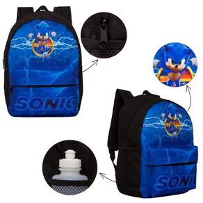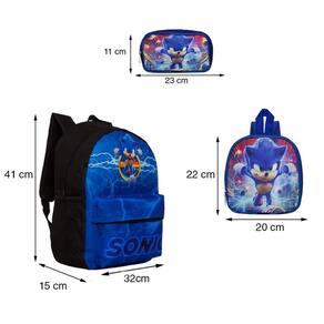 Kit Mochila Escolar Infantil Sonic The Hedgehog, acompanha lancheira e estojo. Possui alça de mão reforçada. Agora você pode levar sua mochila no seu dia a dia ou acompanhar você na escola. Sua abertura maior se dá por zíper com puxador. Na parte de dentro possui amplo espaço para a guardar diversos materiais como cadernos, livros e estojos. Na parte da frente, possui bolso com zíper para a guardar pertences de menor tamanho e bolsos laterais.