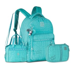 Mochila RB27005: confeccionada em nylon com matelassê de estrelas e corações, traz compartimento principal amplo, divisórias internas, bolso antifurto traseiro, espaço acolchoado para notebook e tablet, bolsos telados laterais e bordado exclusivo no costado. Acompanha chaveiro pompom, mascote 3D, medalhinha de metal, cadarço personalizado e cartela de adesivos.