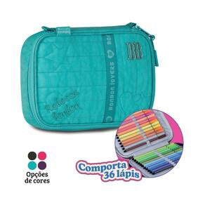 Estojo Box RB27004: espaçoso e funcional, com capacidade para até 100 canetas. Possui 36 elásticos para organizar lápis e canetas, além de um estojo interno separado com fechamento em zíper. Confeccionado em nylon com matelassê elegante. Dimensões: 22x16x6cm.