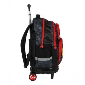 O modelo possui rodinhas integradas, que garantem praticidade, conforto e durabilidade, além de alça superior reforçada e alças acolchoadas para uso nas costas, proporcionando maior ergonomia e bem-estar durante o uso. O logo emborrachado Hot Wheels, combinado com os puxadores personalizados e o material em poliéster resistente, completa o visual autêntico e robusto da coleção.