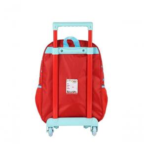 O modelo dispõe de rodinhas resistentes e carrinho embutido, que facilitam o transporte e reduzem o esforço das crianças. Conta ainda com alça superior para manuseio prático e alças para costas, permitindo diferentes formas de uso conforme a necessidade.