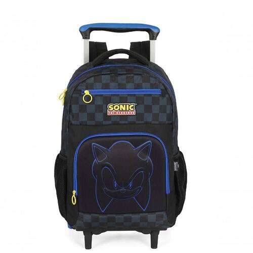Entre seus diferenciais, destacam-se o logo emborrachado, a base com quatro rodas fixas que garantem estabilidade e movimentação suave, e o design frontal em EVA rígido com relevo, que reforça o estilo marcante da linha Sonic. Possui ainda dois bolsos frontais com zíper personalizado e bolso lateral livre, oferecendo praticidade no dia a dia escolar.