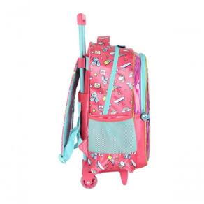O modelo possui rodinhas resistentes e carrinho embutido, facilitando o transporte e reduzindo o esforço das crianças. Conta ainda com alça superior e alças para costas, permitindo diferentes formas de uso conforme a necessidade.