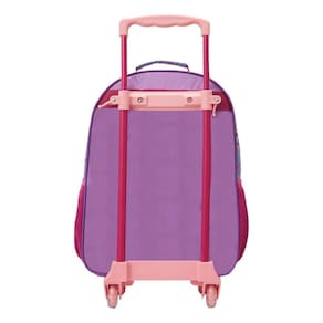 Características / Composição: - Material: Poliéster 420D de alta qualidade. - Carrinho: Metal pintado com hastes arredondadas, 2 rodas com glitter e freio frontal. - Alças: Alça de mão acolchoada em poliéster com nylon para maior conforto. - Puxadores Personalizados: Zíperes exclusivos em metal pintado. - Dimensões: - Largura: 30 cm - Altura: 40 cm - Comprimento: 15 cm