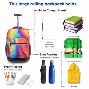 Viaje, volte para a escola ou durma na casa do pijama com estilo, com seus pertences bem guardados na mochila rolante J World Sunrise. A versatilidade da mochila com rodas Sunrise permite que ela funcione tanto como bagagem de mão rolante quanto como mochila com tiras para estudantes. Possui alça telescópica de alumínio leve, rodas macias e silenciosas e molde de proteção inferior para maior durabilidade. Organize todos os seus pertences com um bolso frontal equipado com porta-lápis, chaveiro e bolso de malha, perfeito para guardar itens que podem ser facilmente acessados. Para quem precisa de hidratação em trânsito, tem bolsos laterais de malha que são ideais para guardar garrafas de água e vários outros recipientes para bebidas.