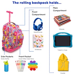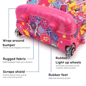 Este conjunto divertido e colorido inclui uma mochila com rodas e uma lancheira isolada e está disponível em padrões fofos para crianças. Funciona como uma bolsa com rodas para a escola e uma divertida mochila de mão para crianças de 3 a 9 anos. A bolsa de rodas Kids possui rodas macias e silenciosas com um sistema magnético de iluminação automática (as crianças vão adorar isso!) e tem um sistema de alça de travamento embutido de três estágios com um botão de liberação. Seu compartimento principal com zíper armazena facilmente os livros, pastas, projetos e jaqueta de seu filho, e um bolso organizador frontal contém um porta-chaves, um porta-lápis e um bolso de malha. Os bolsos laterais de malha contêm garrafas de água, e a mochila rolante J World Lollipop com lancheira tem alças de ombro acolchoadas com malha de ar e uma alça acolchoada. A bolsa também pode ser usada como bagagem de mão de viagem. Seu filho pode transportar essa bagagem de mão infantil com rodas pelo aeroporto com orgulho e você não precisa! Esta mochila de mão cabe embaixo de um assento de avião.