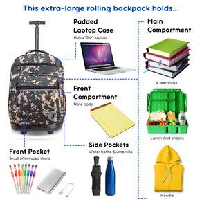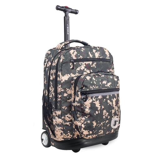 A inovadora e versátil mochila com rodinhas J World Sundance para escolas e viagens possui um compartimento para laptop de 15,6" e um molde de proteção inferior para garantir que seu dispositivo não seja danificado durante a viagem. A mochila para laptop com rodas Sundance pode ser utilizada como bagagem de mão ou como mochila para laptop com tiras que é fácil de transportar. Organize todos os seus pertences com um bolso frontal equipado com porta-lápis, chaveiro e bolso de malha, perfeito para guardar itens que podem ser facilmente acessados. Para quem precisa de hidratação em trânsito, tem bolsos laterais de malha que são ideais para guardar garrafas de água e vários outros recipientes para bebidas. Com enorme capacidade, esta mochila para laptop carrega facilmente um laptop, fichário de 3 polegadas, 3 livros didáticos universitários, cadernos, disco rígido portátil e almoço com espaço de sobra. A alça de alumínio de tubo único se estende até 34 ou 39 polegadas para facilitar a manobrabilidade de crianças e adultos de até 6 pés e 3 polegadas de altura.