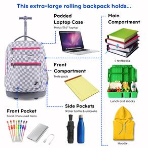 A inovadora e versátil mochila com rodinhas J World Sundance para escolas e viagens possui um compartimento para laptop de 15,6" e um molde de proteção inferior para garantir que seu dispositivo não seja danificado durante a viagem. A mochila para laptop com rodas Sundance pode ser utilizada como bagagem de mão ou como mochila para laptop com tiras que é fácil de transportar. Organize todos os seus pertences com um bolso frontal equipado com porta-lápis, chaveiro e bolso de malha, perfeito para guardar itens que podem ser facilmente acessados. Para quem precisa de hidratação em trânsito, tem bolsos laterais de malha que são ideais para guardar garrafas de água e vários outros recipientes para bebidas. Com enorme capacidade, esta mochila para laptop carrega facilmente um laptop, fichário de 3 polegadas, 3 livros didáticos universitários, cadernos, disco rígido portátil e almoço com espaço de sobra. A alça de alumínio de tubo único se estende até 34 ou 39 polegadas para facilitar a manobrabilidade de crianças e adultos de até 6 pés e 3 polegadas de altura.