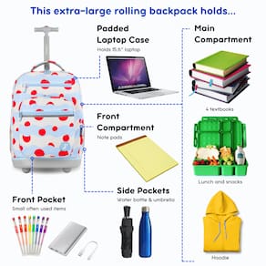 A inovadora e versátil mochila com rodinhas J World Sundance para escolas e viagens possui um compartimento para laptop de 15,6" e um molde de proteção inferior para garantir que seu dispositivo não seja danificado durante a viagem. A mochila para laptop com rodas Sundance pode ser utilizada como bagagem de mão ou como mochila para laptop com tiras que é fácil de transportar. Organize todos os seus pertences com um bolso frontal equipado com porta-lápis, chaveiro e bolso de malha, perfeito para guardar itens que podem ser facilmente acessados. Para quem precisa de hidratação em trânsito, tem bolsos laterais de malha que são ideais para guardar garrafas de água e vários outros recipientes para bebidas. Com enorme capacidade, esta mochila para laptop carrega facilmente um laptop, fichário de 3 polegadas, 3 livros didáticos universitários, cadernos, disco rígido portátil e almoço com espaço de sobra. A alça de alumínio de tubo único se estende até 34 ou 39 polegadas para facilitar a manobrabilidade de crianças e adultos de até 6 pés e 3 polegadas de altura.