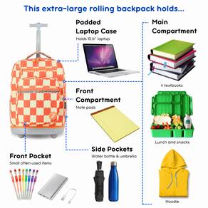 A inovadora e versátil mochila com rodinhas J World Sundance para escolas e viagens possui um compartimento para laptop de 15,6" e um molde de proteção inferior para garantir que seu dispositivo não seja danificado durante a viagem. A mochila para laptop com rodas Sundance pode ser utilizada como bagagem de mão ou como mochila para laptop com tiras que é fácil de transportar. Organize todos os seus pertences com um bolso frontal equipado com porta-lápis, chaveiro e bolso de malha, perfeito para guardar itens que podem ser facilmente acessados. Para quem precisa de hidratação em trânsito, tem bolsos laterais de malha que são ideais para guardar garrafas de água e vários outros recipientes para bebidas. Com enorme capacidade, esta mochila para laptop carrega facilmente um laptop, fichário de 3 polegadas, 3 livros didáticos universitários, cadernos, disco rígido portátil e almoço com espaço de sobra. A alça de alumínio de tubo único se estende até 34 ou 39 polegadas para facilitar a manobrabilidade de crianças e adultos de até 6 pés e 3 polegadas de altura.