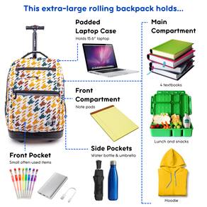 A inovadora e versátil mochila com rodinhas J World Sundance para escolas e viagens possui um compartimento para laptop de 15,6" e um molde de proteção inferior para garantir que seu dispositivo não seja danificado durante a viagem. A mochila para laptop com rodas Sundance pode ser utilizada como bagagem de mão ou como mochila para laptop com tiras que é fácil de transportar. Organize todos os seus pertences com um bolso frontal equipado com porta-lápis, chaveiro e bolso de malha, perfeito para guardar itens que podem ser facilmente acessados. Para quem precisa de hidratação em trânsito, tem bolsos laterais de malha que são ideais para guardar garrafas de água e vários outros recipientes para bebidas. Com enorme capacidade, esta mochila para laptop carrega facilmente um laptop, fichário de 3 polegadas, 3 livros didáticos universitários, cadernos, disco rígido portátil e almoço com espaço de sobra. A alça de alumínio de tubo único se estende até 34 ou 39 polegadas para facilitar a manobrabilidade de crianças e adultos de até 6 pés e 3 polegadas de altura.