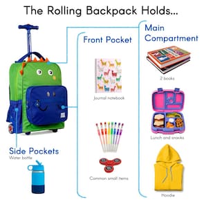 Esta mochila com rodinhas para crianças se transforma de uma mochila rolante sobre rodas em uma mochila vestível com alças. Possui um grande compartimento principal, 2 bolsos laterais e um organizador de bolso frontal. Medindo 16 x 12 x 5 polegadas, esta mochila também foi projetada para ser usada como bolsa de mão embaixo do assento para viagens de avião. A alça de alumínio de tubo único se estende para facilitar a manobrabilidade das crianças. A alça telescópica é armazenada em uma bolsa. O fundo de borracha moldada resiste à punição de arrasto no pavimento. Chega de buracos na parte inferior da mochila rolante de seus filhos! Feita de tecido durável de poliéster ripstop com estrutura de metal e bordas reforçadas, esta mochila com rodinhas para meninos e meninas tem um revestimento resistente à água para manter seu equipamento seco. A fita reflexiva oferece visibilidade noturna. Possui alças de ombro almofadadas em malha de ar e almofada traseira, ou use a alça acolchoada para carregar esta mochila dobrável para meninas e meninos. Esta linda bolsa com rodas para crianças se transforma rapidamente em uma mochila vestível ao subir escadas ou em terrenos acidentados, basta retirar as alças da mochila. Para voltar a ser uma mochila de viagem com rodinhas, basta colocar as alças no bolso traseiro, sem precisar abrir o zíper. Grandes rodas de mochila de borracha rolam e giram sem esforço em calçadas, caminhos e corredores de aviões. As rodas montadas nos cantos fornecem estabilidade extra. Nossa promessa - na Twise, garantimos 100% de nossos produtos. Se você tiver algum problema com esta mochila com rodinhas para meninas e meninos, faremos as coisas da maneira certa.