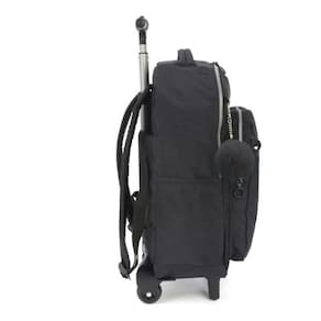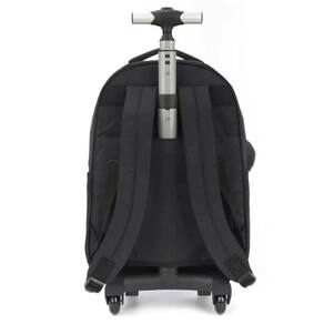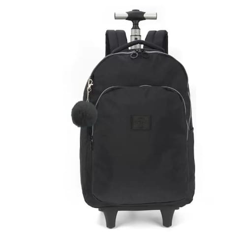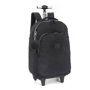 Confeccionada em poliéster a mochila possui puxador em formato "T" com regulagem de tamanho, as rodinhas são fixas e na frente possui suporte para a mochila ficar em pé. As alças de costas são confortáveis e com regulagem.