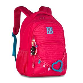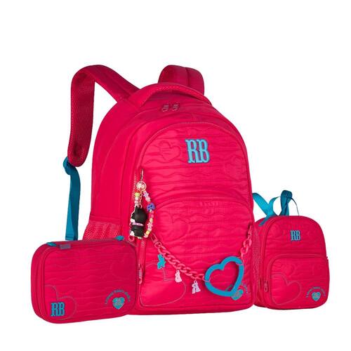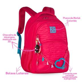 Características Mochila: - Alça de mão - Alça de costas - Alça carona - Bolso antifurto - Bolsos Laterais - Confeccionados em material soft com Matelassê localizado com corações - Chaveiros de miçangas, mascote 3D - Corrente com coração emborrachado e pingentes - Logo RB em metal colorido - Zíper tratorado com puxadores com cadarço - Compartimentos para laptop + tablet- Forro rossa listrado