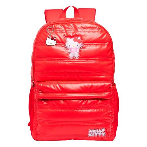 Características: - Confeccionada em Puffer - Alça de mão - Alças acolchoadas e ajustáveis - Dois bolsos laterais em mesh - Puxadores de zíper personalizados - Chaveiro Hello Kitty - Forro personalizado