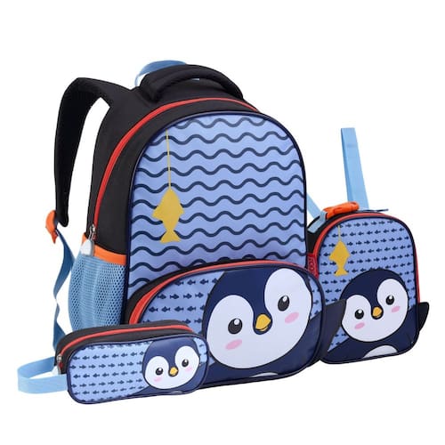Com design super fofo de pinguim, esse kit é perfeito para acompanhar os pequenos com praticidade, conforto e estilo no dia a dia escolar.