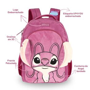 Características: - Alça de mão - Alça de Costas ajustável e acolchoada - Bolso Lateral Telado - Logo Emborrachado - Frente Peluciado - Orelhas em 3D - Etiqueta UP4YOU Emborrachada - Zíper com Puxadores Personalizados - Contorno do Stitch bordado