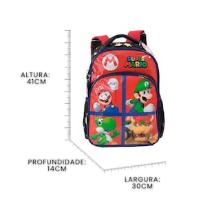 Mochila Costas Super Mario Bros Infantil Escolar Meninos - Luxcel Mochila de costas infantil Super Mario Bros, ideal para meninos em idade escolar. Com estampa vibrante dos personagens, alças ajustáveis e amplo espaço interno, é perfeita para o dia a dia na escola com estilo e diversão. Características Mochila: Alça de mão Alça de costas Bolsos laterais Identificador personalizado Puxadores em Zíper Especificações Mochila: Marca: Super Mario Medidas Aproximadas Mochila A x L x P : 41cm x 30cm x 14cm Peso: 500g Aprox Capacidade: 17L Composição do produto: Poliéster e PVC Conteúdo da Embalagem: IS41391MO - 1 Mochila Costas Super Mario As cores podem variar entre as imagens mostradas acima e o produto. Imagens meramente ilustrativas. Todas as informações divulgadas são de responsabilidade exclusiva do fabricante. de 90 dias contra defeito de fabricação. Marca: Não Informado