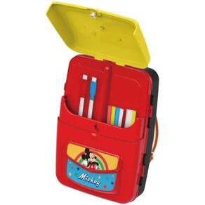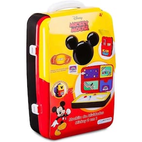 Ao abri-la, você encontra diversos acessórios, como letras magnéticas, canetas, giz, apagador e cartões do Mickey. Com uma lousa retrátil e dupla face (branca e de giz), oferece várias possibilidades criativas. Além de proporcionar horas de diversão, estimula habilidades motoras, criatividade e imaginação.