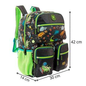 Características / Composição: - Material: Poliéster 420D com PVC reticulado, garantindo resistência e fácil manutenção. - Dimensões: - Largura: 30 cm. - Altura: 42 cm. - Comprimento: 14 cm. - Detalhes Especiais: - Chaveiro Exclusivo: Um acessório divertido que complementa o tema Dino. - Puxadores Personalizados: Agregam um toque único e moderno ao design. - Bolsos Laterais: Perfeitos para itens como garrafas e guarda-chuvas. - Compartimentos Internos: Espaçosos, facilitando a organização de livros, cadernos e outros itens.