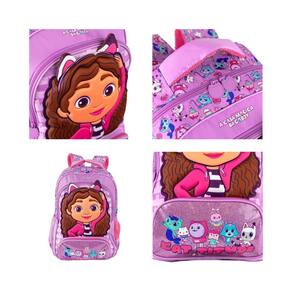 Características Mochila: - Estampa oficial da Casa da Gabby - Alça de mão acolchoada - Alça de costas acolchoadas e ajustáveis - Desenho Gabby em EVA alto relevo - Bolsos Laterais p/garrafinhas