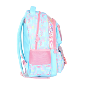Marca: Luxcel (Licenciado Oficialmente Barbie) Personagem: Barbie Cor Predominante: AZUL CLARO/TURQUESA com detalhes em PINK. Detalhes Holográficos: Bolsos frontais e logo em material holográfico/iridescente que brilha. Estampa: Padrão sutil com logos e óculos da Barbie. Tamanho (G): Amplo espaço interno, ideal para cadernos grandes e materiais escolares. Conforto: Alças de costas acolchoadas e ajustáveis e alça de mão superior. Compartimento principal com zíper. Bolsos frontais diversos (um com aba e fita de ajuste, e outro com tela/rede, ambos com zíper). Bolsos laterais em rede (mesh) na cor pink para garrafas. Detalhes: Puxadores de zíper personalizados.