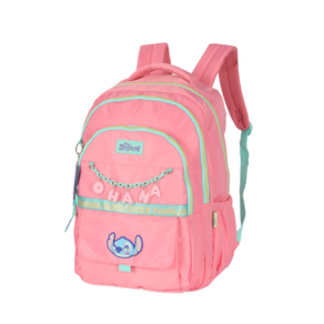 Leve a Ohana com Delicadeza! Mochila de Costas G do Stitch ROSA SALMÃO: Conforto, Estilo e Fofura! Para os fãs do Stitch que preferem o modelo de alças, esta Mochila de Costas Oficial da Disney é a opção perfeita! O design é suave em Rosa Salmão (Rosa Claro), com detalhes em Azul Turquesa e estampa o tema "Ohana Quer Dizer Família". A mochila oferece o máximo de conforto com as alças de ombro acolchoadas e ajustáveis. É ampla, com compartimentos pensados para a organização do material escolar. O toque especial fica por conta do chaveiro da Angel (Pink) e a alça decorativa de correntes.