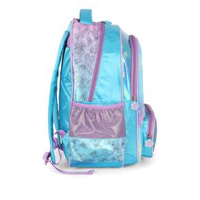 Organização: Amplo compartimento principal com fechamento em zíper. Bolso frontal com zíper e acabamento em glitter. Bolsos laterais em tela/rede (mesh) com detalhes em glitter, ideais para garrafas. Detalhes: Puxadores de zíper personalizados e alça de mão.