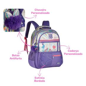 Características Mochila: - Alça de mão - Alça de costas - Bolsos laterais telados - Forro interno rosa - Compartimento de Laptop e Tablet - Mosquetão formato de coração - Chaveiro pompom e estrela acrílico - Logo metalizado - Patches atoalhados - Puxador personalizado - Zíper tratorado