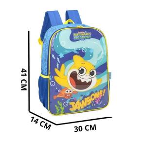 Mochila possui um espaçoso compartimento principal, permitindo que seu filho armazene todos os materiais escolares de maneira organizada. Além disso, apresenta um bolso frontal amplo com estampa do rosto do Baby Shark, adicionando um toque de alegria ao visual.
