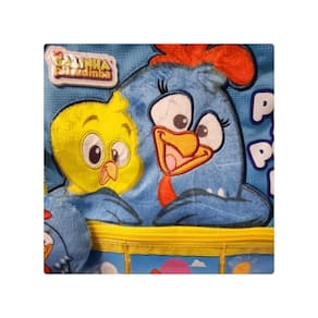 Confeccionada em cetim de alta qualidade, ela vem com alças acolchoadas para usar nas costas. E o melhor: acompanha livreto para colorir e personalizar, além de chaveiro com som e patch em pelúcia da galinha pintadinha