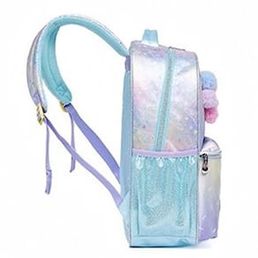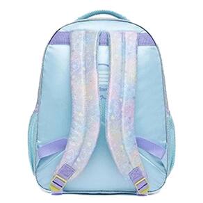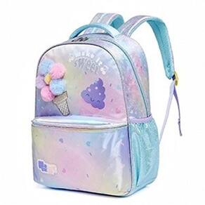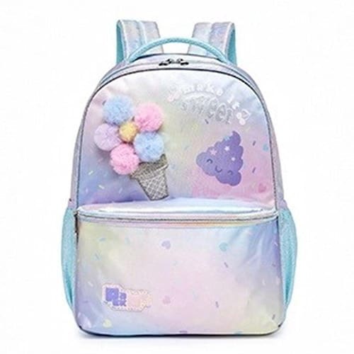 Coleção confeccionada em cetim com estampa corrida. Painel frontal com impressão em transfer com aplicação de glitter localizado. Sorvete 3D feito de pompons de tule. Patch de PU com glitter com bordado. Impressão em transfer e patch PVC no bolso frontal. Puxador de zíper em metal com logo em baixo relevo. Etiqueta de identificação em silk impressa no painel traseiro.