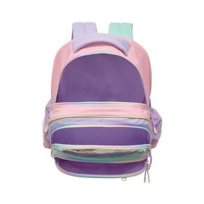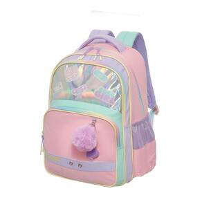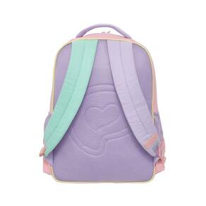 Mochila de costas, que conta com estampa frontal, bolso frontal, telinha lateral, compartimento grande com fechamento em zíper e etiquetas personalizadas.