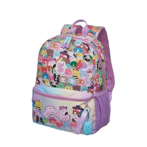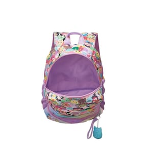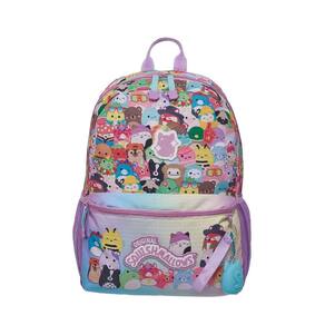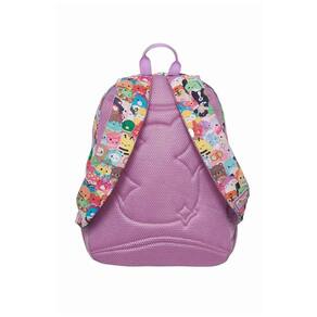 Mochila de costas, que conta com estampa frontal, bolso frontal, telinha lateral, compartimento grande com fechamento em zíper e etiquetas personalizadas.