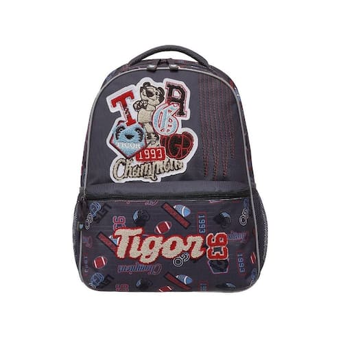 Mochila Tigor T Tigre, que conta com estampa frontal, bolso frontal, telinha lateral, compartimento grande com fechamento em zíper e etiquetas personalizadas.