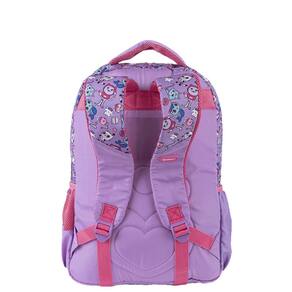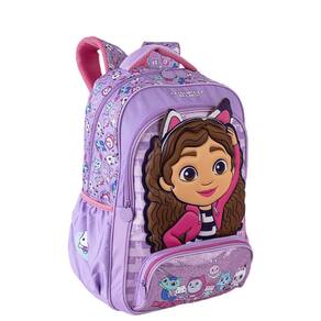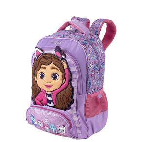 Mochila com bolsos laterias em tela com elástico, alças de costas reguláveis, estampa frontal, bolso frontal com zíper, alça de mão e etiquetas personalizadas.