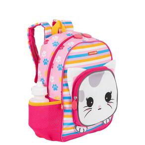 Mochila escolar Sestini com alças de costas espumadas e reguláveis, bolso lateral em tela com elástico, tag identificador, painel frontal em cetim e etiquetas personalizadas.