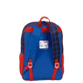 Mochila com bolsos laterias em tela com elástico, alças de costas reguláveis, tag identificador, painel frontal em PVC, alça de mão e etiquetas personalizadas.