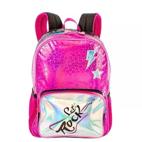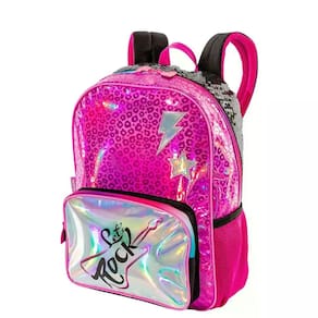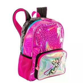 Mochila com bolsos laterias em tela com elástico, alças de costas reguláveis, estampa frontal, bolso frontal com zíper, alça de mão e etiquetas personalizadas.