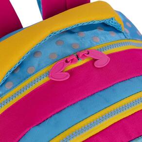 Mochila de costas Sestini Neon, conta com alça carona, bolsos laterais em tela com elástico, tag identificador, bolso frontal com fechamento em zíper e etiquetas personalizadas.