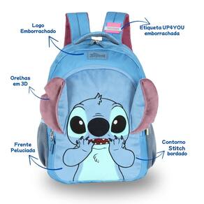 Características: - Alça de mão - Alça de Costas ajustável e acolchoada - Bolso Lateral Telado - Logo Emborrachado - Frente Peluciado - Orelhas em 3D - Etiqueta UP4YOU Emborrachada - Zíper com Puxadores Personalizados - Contorno do Stitch bordado