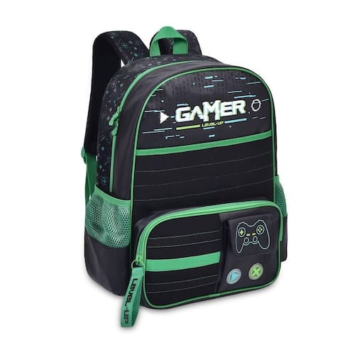 Para os pequenos gamers que preferem uma mochila de costas, esta traz uma estampa descolada e moderna, com todas as funcionalidades que você precisa para o dia a dia escolar, fazendo seu filho brilhar nos corredores da escola. Mochila de Costas VD24529J Essa mochila de costas oferece espaço de sobra para os materiais escolares, com um compartimento principal espaçoso, bolso frontal com fechamento por fitas autoadesivas e outro com zíper para itens menores. Os bolsos laterais telados são perfeitos para garrafas, e o bolsinho frontal adicional é um ótimo lugar para pequenos objetos. A mochila foi confeccionada em poliéster com detalhes de neoprene, lona resinada e material holográfico, garantindo um visual diferenciado que chama atenção. Além de estilosa, é muito prática, com alças ajustáveis e confortáveis para um transporte leve e fácil.