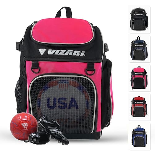 Vizari Mochila de futebol com compartimento de bola e bolso de bola ventilado e bolsos cargo laterais de malha para adultos e adolescentes