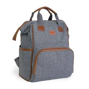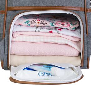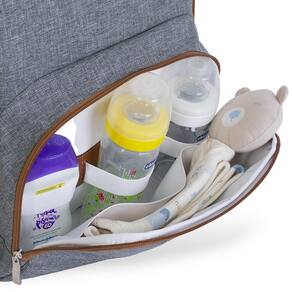 Mochila Multifuncional em nylon. O seu interior é impermeável e possui 2 bolsos laterais com elástico. Na parte externa frontal ela possui bolso térmico com elásticos para 3 garrafas ou mamadeiras, 1 bolso lateral para garrafa e 1 bolso lateral com zíper para lenços umedecidos. Nas costas ela possui uma abertura para o interior da bolsa e também um bolso de segurança com zíper e abertura para acoplar nas malas de carrinho. Acompanha trocador. A mochila multifuncional além de linda é uma facilitadora nas saídas com o bebê, pois possui muitos compartimentos e permite que os pais fiquem com as mãos livres para melhor atender ao bebê.