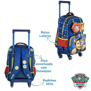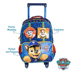 Pronta para a próxima missão! A mochila de rodas da Patrulha Canina é perfeita para os pequenos aventureiros. Com estampa dos personagens favoritos, rodinhas resistentes, alça retrátil e compartimento espaçoso para o material escolar. Ideal para o dia a dia na escola com praticidade e diversão!