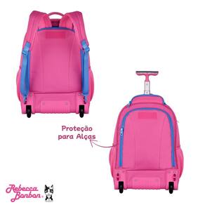 Características Mochila: - Estampa oficial da Rebecca Bonbon - Rodinhas resistentes - Alça retrátil tipo carrinho + alças acolchoadas de costas - Bolsos frontais e laterais para acessórios - Compartimento para Laptop + Tablet - Cadarço Com Etiquetas De Borracha - Prensado em Formato de Flores - Preoteção para Rodas e Alças - Chaveiro de Borracha + RB 3D