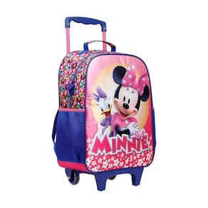 Mochila de Rodinha Rosa Escolar Minnie Xeryus Em tamanho 14 com Alças de ombro , produzida em cetim estampado. Painel frontal em cetim vincado - Compartimento principal amplo, 2 bolsos laterais mesh, zíper com puxadores personalizado, alça de mão em nylon com poliester e piping forrado. Carrinho em metal com travas.