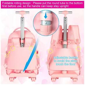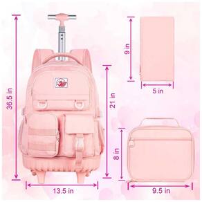 Conjunto 3 em 1 composto por mochila de rodinhas, lancheira e estojo, indicado para adolescentes, estudantes e mulheres que precisam de um conjunto escolar e de viagem com boa capacidade de organização. A mochila principal pode ser usada nas costas ou como mala com rodinhas, oferecendo compartimento principal amplo com bolso acolchoado para laptop, compartimento intermediário com divisórias, bolsos frontais e bolsos laterais em tela para garrafa.