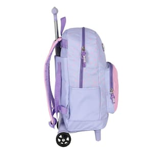 Mochila de rodinhas com alça, bolsos laterias em tela com elástico, alças de costas espumadas e reguláveis, silk frontal, bolso frontal com zíper, alça de mão e etiquetas personalizadas.